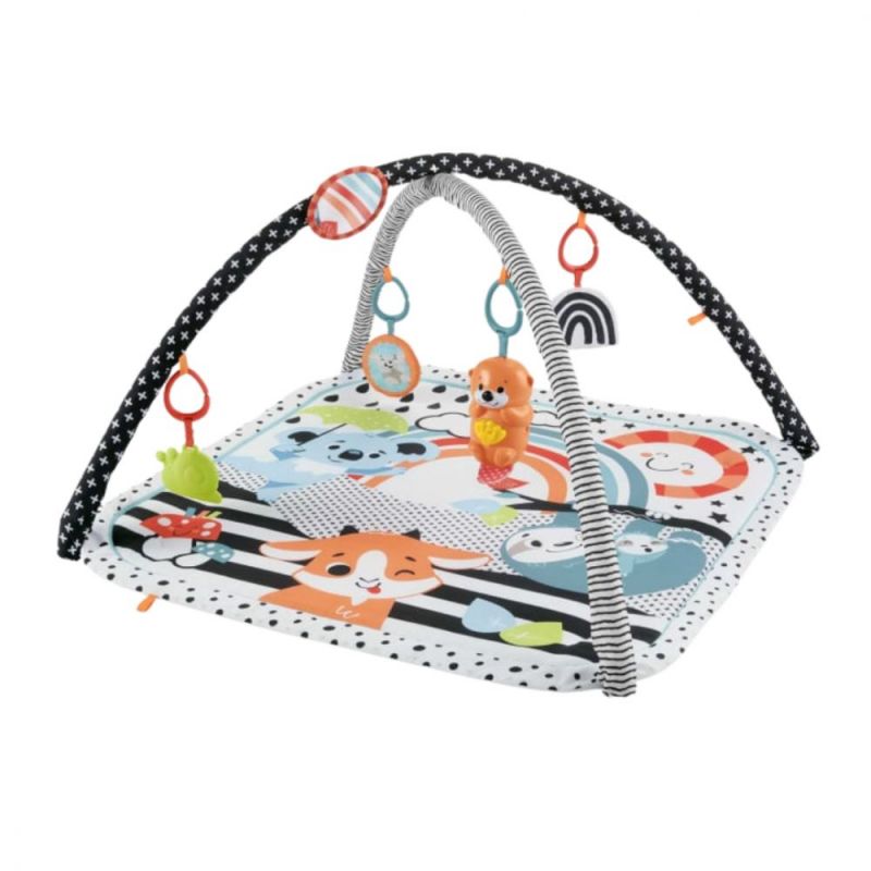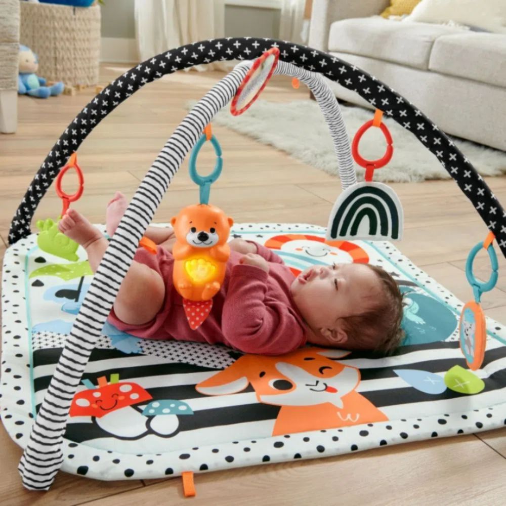 - Viene con 5 juguetes de actividad: nutria con música y luces con colita suave, espejo de autodescubrimiento, sonaja de erizo suave, mordedera de caracol libre de BPA y juguete de arcoÃris con textura de dos lados