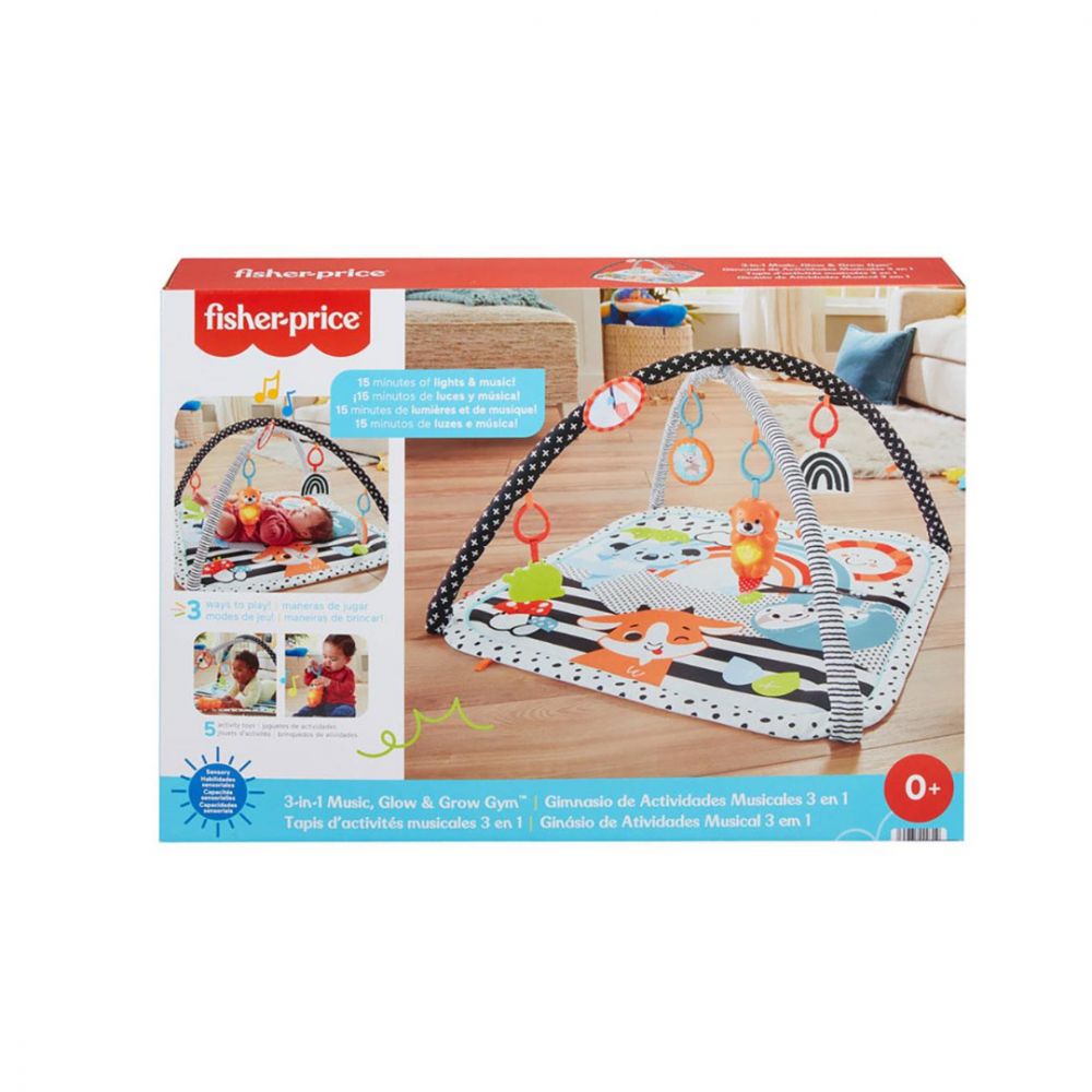 La alfombra de juego de actividad Gimnasio Música, Brilla y Crece 3 en 1 de Fisher-Price® es perfecta para que tu peque “brille†mientras juega. Los recién nacidos pueden alcanzar, golpear y agarrar los 5 juguetes de actividad enlazables, incluidos un espejo, una sonaja de erizo suave, una mordedera de caracol libre de BPA, un juguete de arcoÃris con textura y una nutria con música y luces. ¡La nutria con música y luces reproduce 15 minutos de música y enciende una luz suave que hace que el tiempo de juego sea más divertido dentro o fuera de la alfombra! A medida que el bebé crece, puedes quitar los dos arcos para que tu peque pueda jugar boca abajo en toda la alfombra y estimule los músculos del cuello y del torso. Además, los colores de alto contraste del gimnasio pueden ayudar a estimular el desarrollo visual más temprano del bebé.