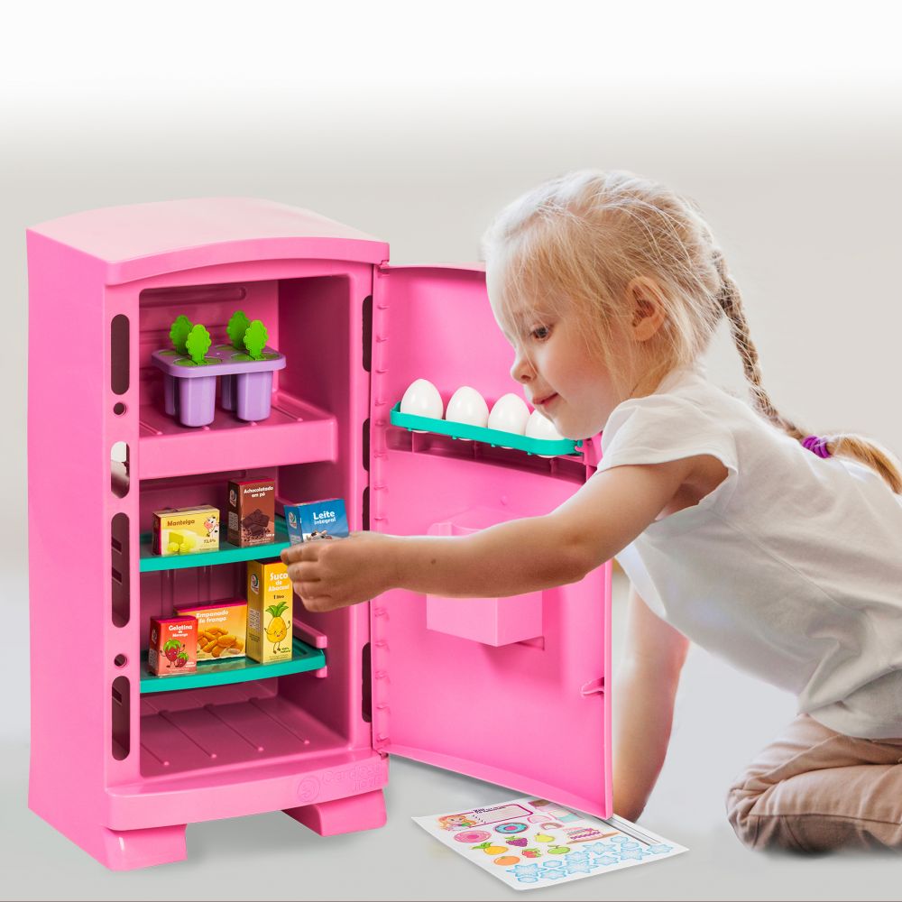 Esta hermosa heladera es grande, de 50 cms de altura y con varios accesorios para jugar, tiene un dispensador de agua de juguete en la puerta, estantes internos, huevera con 4 huevos, molde para hacer paletas, pack de pegatinas y cajitas para cortar y montar que hacen el juego aún más divertido!