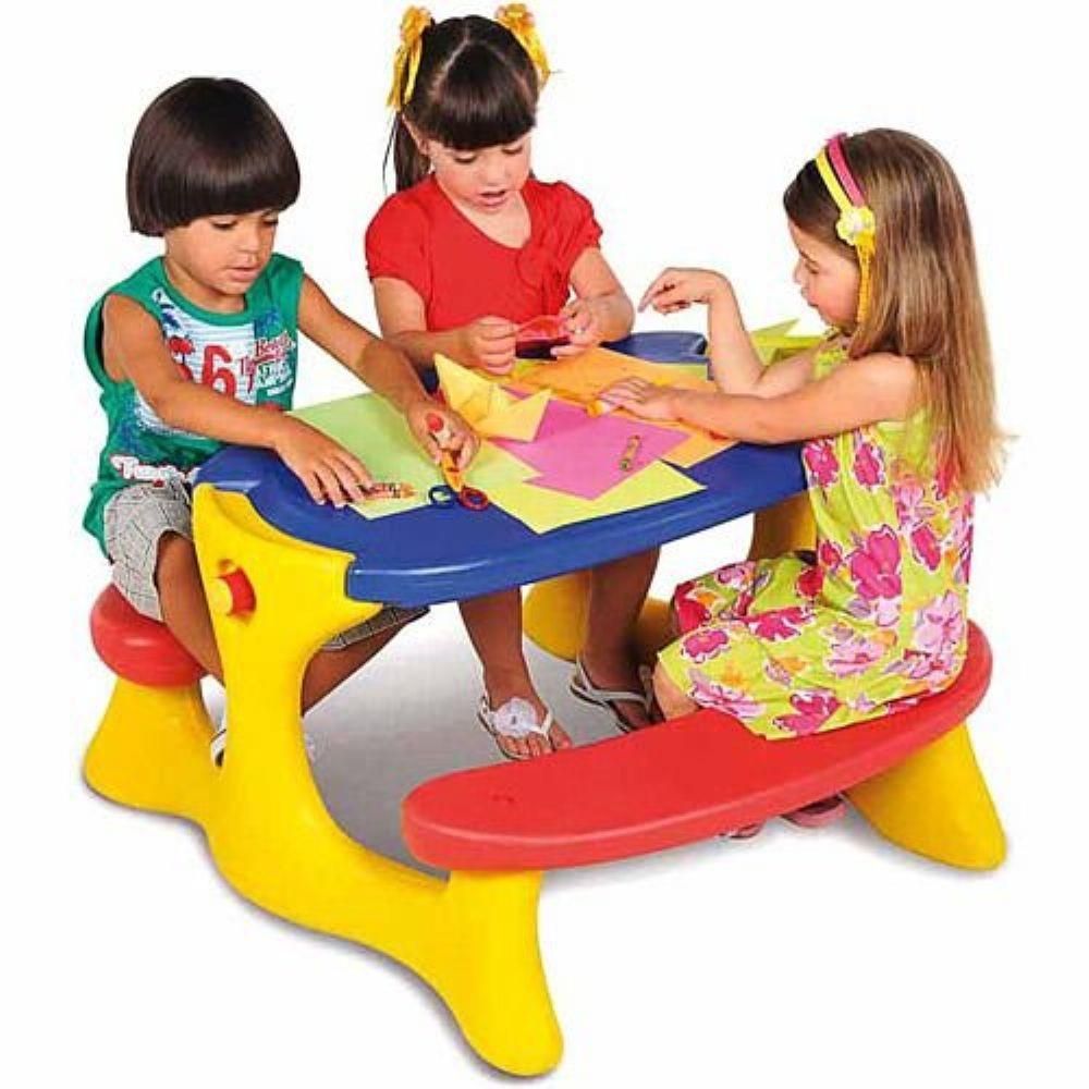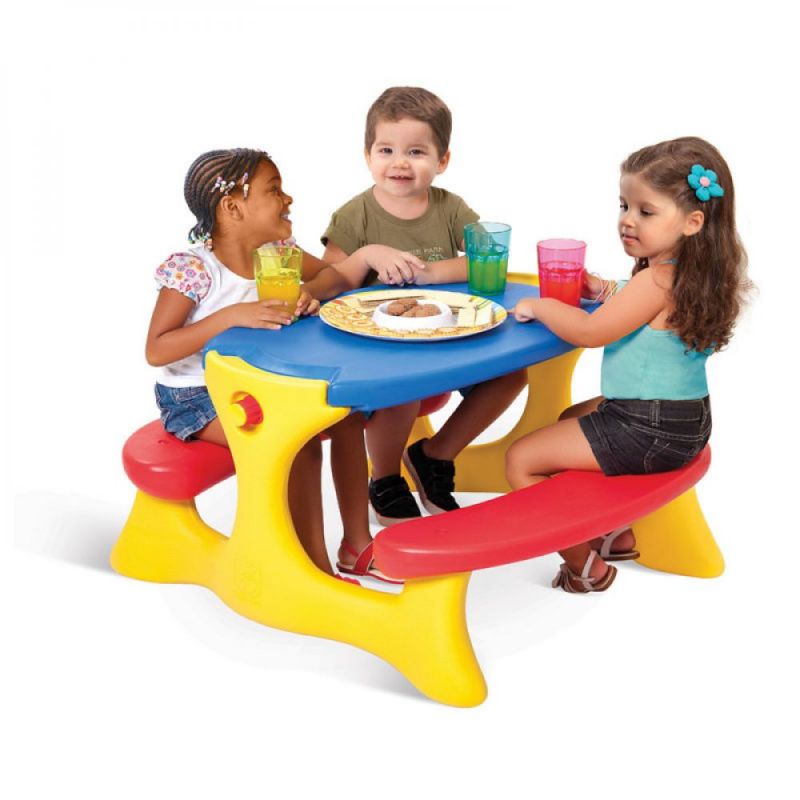 Mesa picnic de material plástico reforzado para hasta 4 niños. Modelo versátil que puede ser utilizado para tareas, actividades manuales, comidas y otras actividades infantiles.