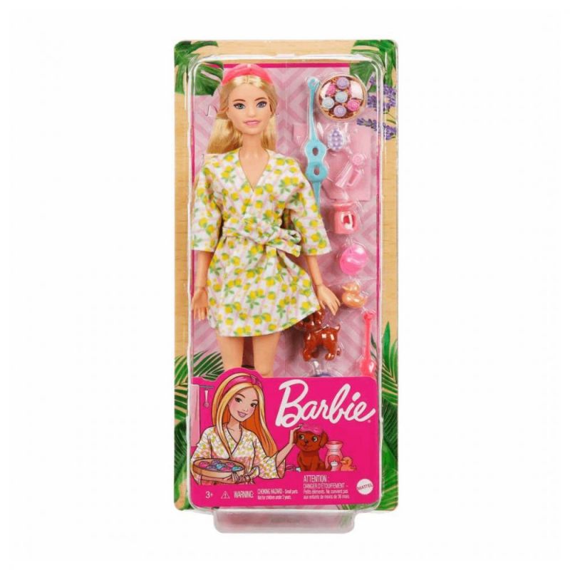 Los niños pueden practicar el autocuidado ya que ayudan a la muñeca Barbie a recargar con este juego temático de spa que incluye una muñeca, un cachorro y 9 accesorios temáticos para una experiencia favorita.