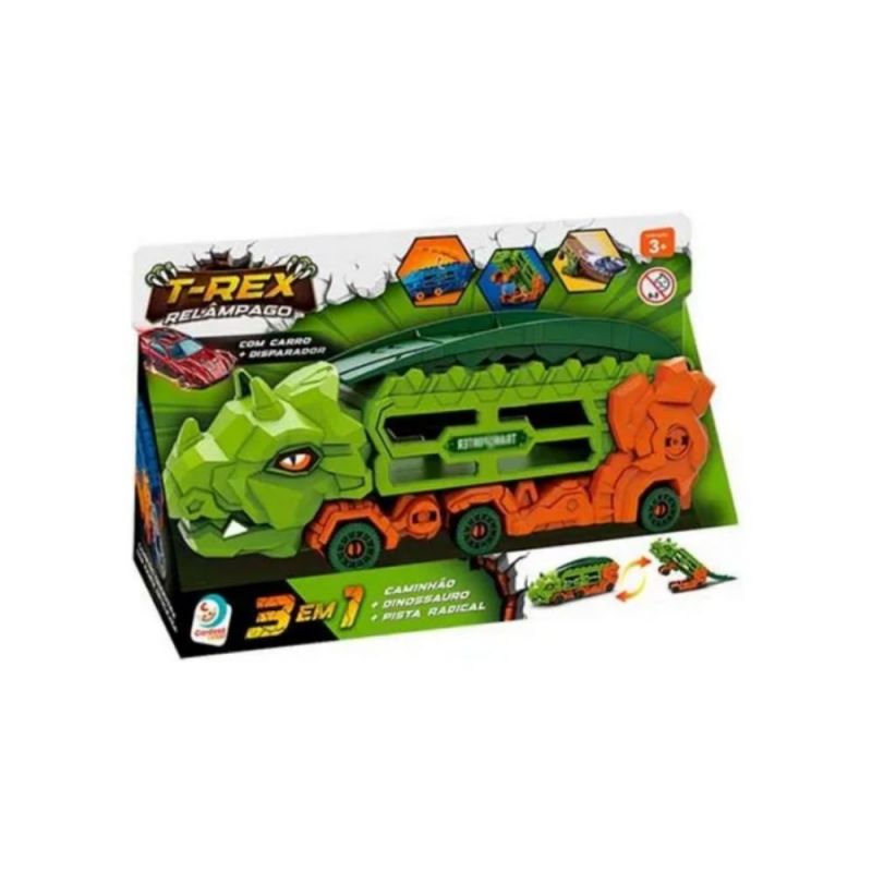 El Remolque T Rex Relámpago Cardoso Toys 7165 es un juguete 3 en 1 lleno de aventura: puede transformarse en camión, dinosaurio o pista radical — para que los niños vivan múltiples juegos en un solo set. Incluye, además del vehículo transformable, un autito (carro disparador) que permite hacer carreras, lanzamientos y escenas de rescate o exploración.