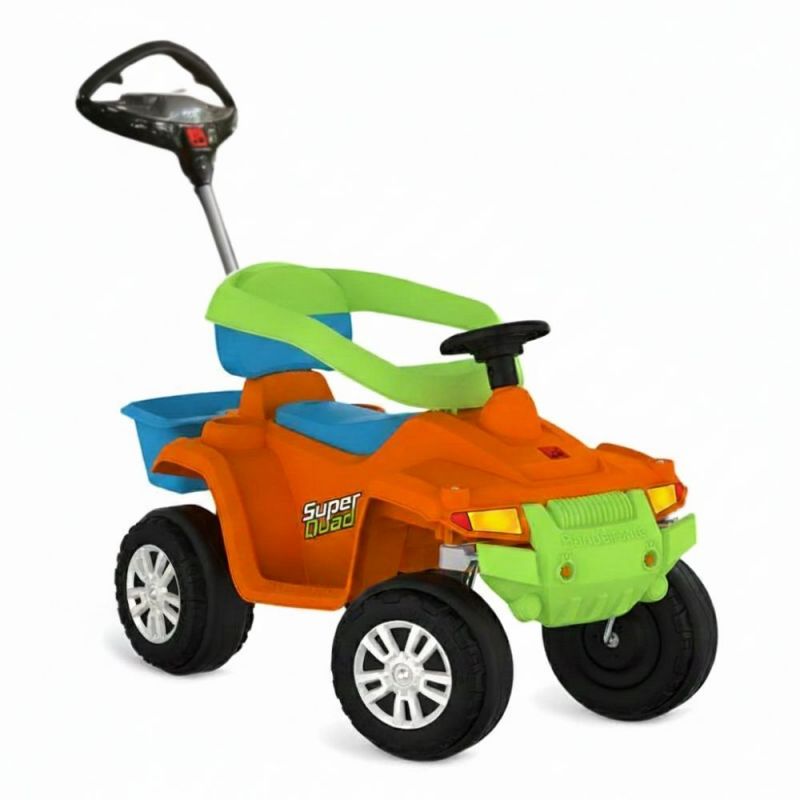 El SuperQuad es un producto versátil diseñado para niños a partir de los 12 meses, brindando una experiencia divertida y segura tanto para los pequeños como para los adultos que lo conducen. Con una barra de empuje removible, soporte para botellas, y un cercado de protección interactivo, este vehículo ofrece comodidad y seguridad. Sus materiales resistentes y detalles pensados para el confort del niño, como el respaldo elevado y los reposapiés, lo convierten en una excelente opción para el desarrollo infantil.