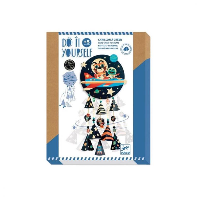 Un kit creativo completo para hacer un móvil fosforescente sobre el tema del espacio... El niño enhebra las campanillas, las cuentas de madera y los conos ilustrados en los hilos encerados y los ata al soporte proporcionado. Cuando los hilos se mueven, el móvil suena agradablemente y se ilumina en la oscuridad. ¡Los niños estarán orgullosos de decorar su habitación con su creación! Práctico: el paso a paso está detallado en las instrucciones para guiar al niño en todas las etapas de su creación. Do it yourself (DIY o hazlo tú mismo) de Djeco es una colección de actividades lúdicas y accesibles que permite desarrollar todos los talentos a través de modelos únicos para crear, fomentando la paciencia, la creatividad y la destreza al mismo tiempo... Diseñados para uno o varios niños, estos kits son ideales para pasar un tiempo recreativo solo o compartido con otros niños (fiestas de cumpleaños, etc.). Referencia del juguete: Móvil para crear "Estrellas" DIY DJECO 7956 Producto certificado FSC (C074685) Dimensiones de la caja: 26 x 20 x 4.5 cm Diámetro del soporte: 18 cm Longitud total del móvil: 40 cm Diseño: Ben Newman Edad: a partir de 5 años Contenido: 8 conos, 1 surtido de cuentas de madera de colores, 5 hilos encerados, 5 campanillas, 1 lámina de pegatinas y 1 manual de instrucciones a color.