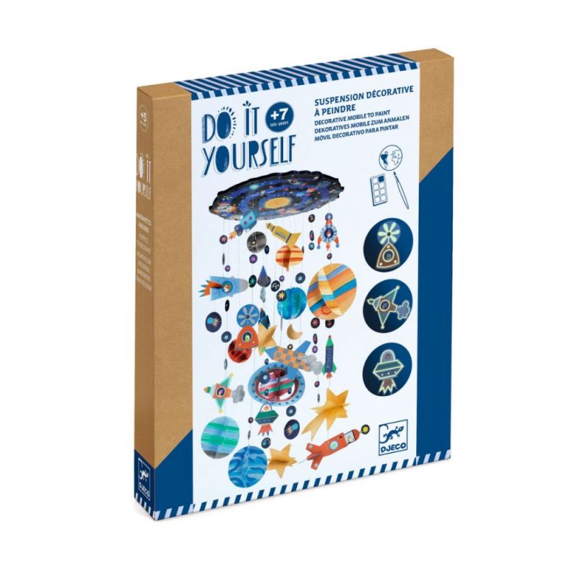 Contenido: 1 base de cartón ilustrada, 5 tableros con 8 planetas y 3 estrellas precortadas para pintar, 2 tableros con elementos decorativos ilustrados precortados (cohetes, estrellas, cometas), 1 paleta de gouache (8 colores), 1 pincel, 10 m de hilo de nylon, 1 gancho autoadhesivo, 1 hoja de pegatinas de doble cara, instrucciones de montaje y 1 cuadernillo sobre los planetas y el sistema solar.