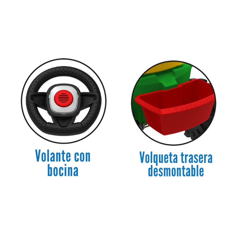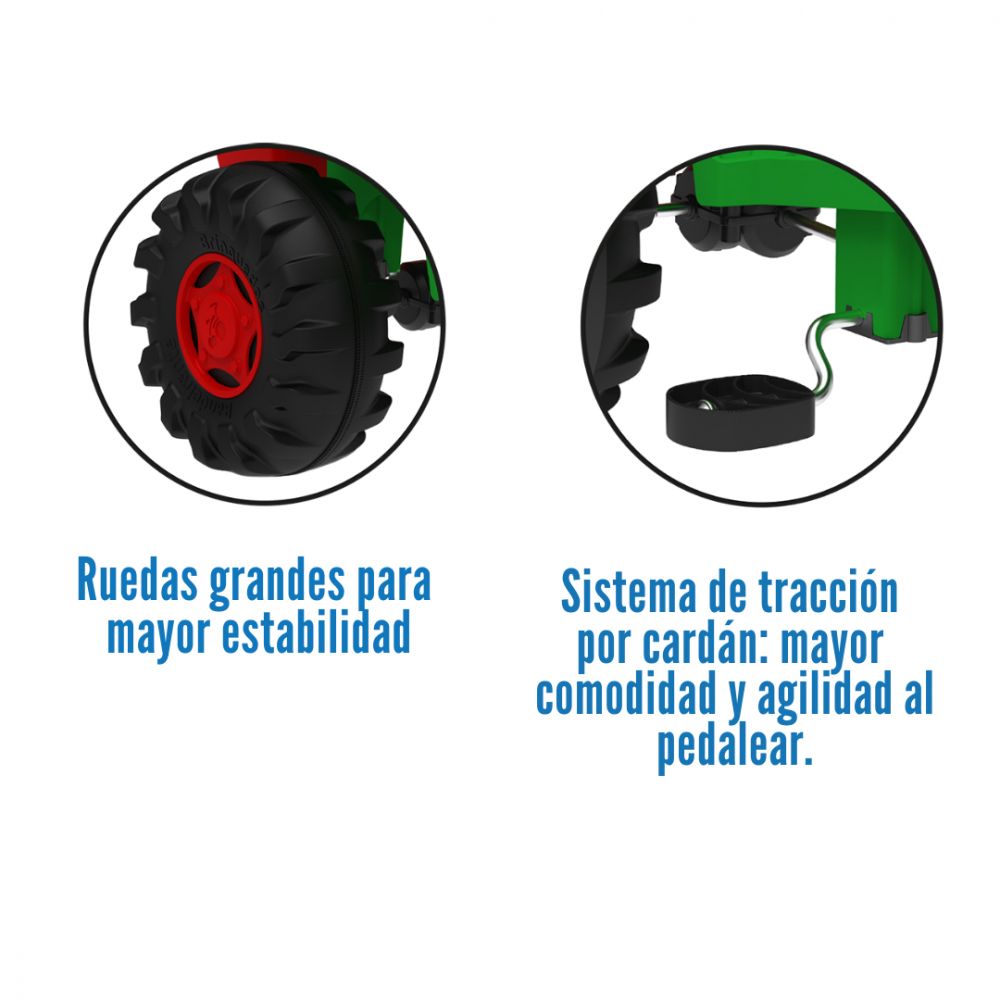 El Tractor a Pedales es el juguete ideal para estimular la imaginación y la coordinación motora de los niños. Con su sistema de pedales, los pequeños pueden controlar la velocidad mientras se divierten. Equipado con una tolva/cajón trasero funcional, ofrece aún más interactividad durante el juego, ya sea transportando juguetes o explorando el jardín. Su sistema de tracción por cardán garantiza comodidad y agilidad al pedalear, mientras que el volante con bocina añade realismo y fomenta el juego de roles, haciendo la experiencia aún más completa.